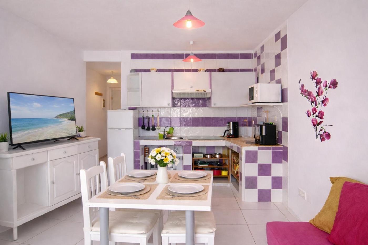 El apartamento cuenta con terraza y vistas a la piscina, y tiene 1 dormitorio, una sala de estar, TV de pantalla plana, una cocina equipada con nevera y microondas, y 1 baño con bidet. Hay toallas y ropa de cama en el apartamento.